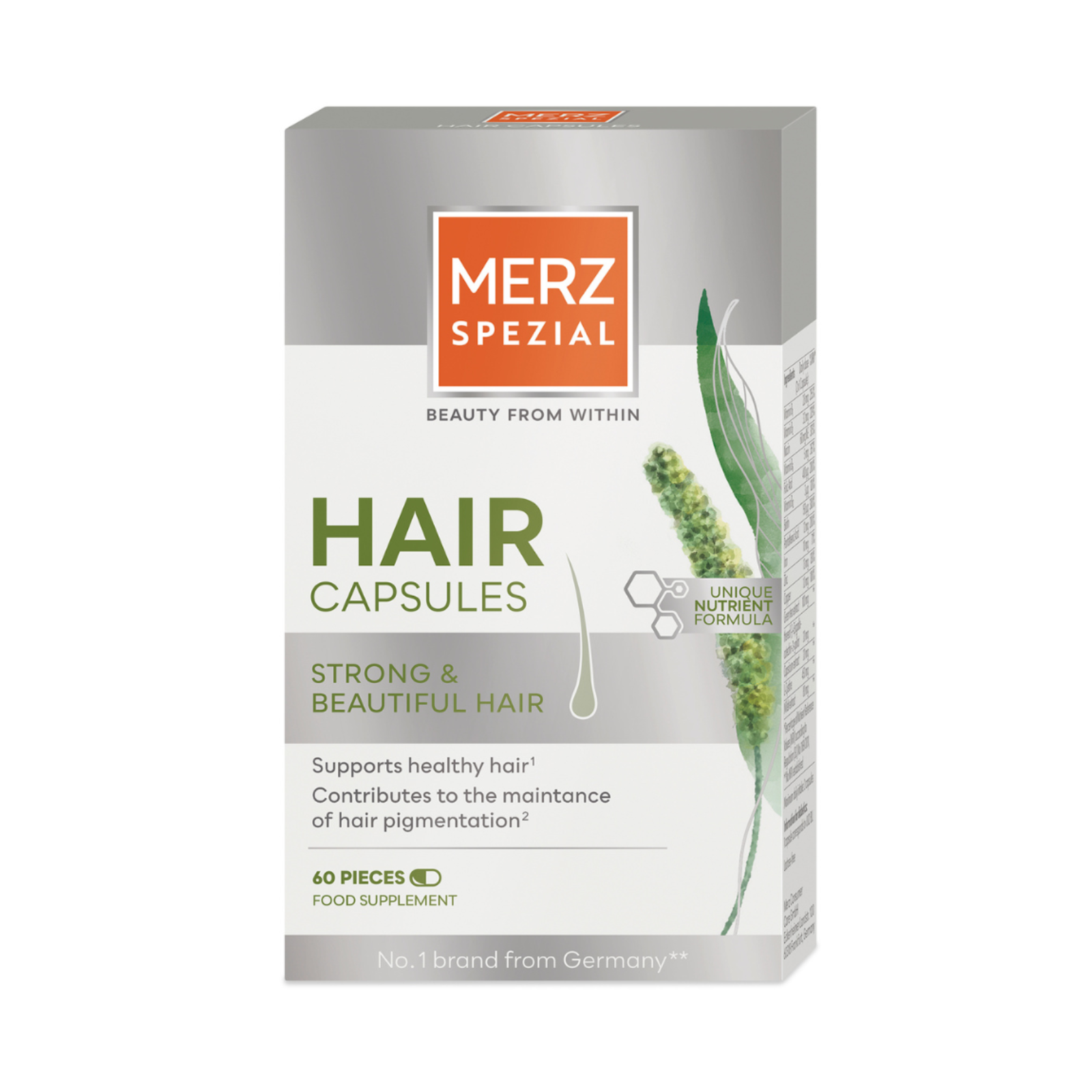 Merz Spezial Capsule pentru păr este supliment alimentar care combină L-cistină, extract din frunze de Ceai-verde (Camellia sinensis), Extract din fructe de ardei iute (Capsicum annuum), Extract din semințe de mei (Panicum miliaceum), vitamine din complexul B și minerale.